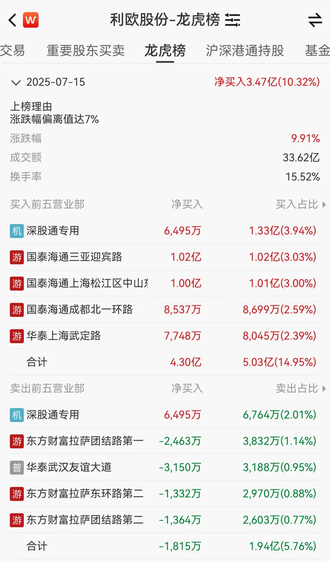 具体来看,深股通专用席位、游资“佛山系”所在的国泰海通证券三亚迎宾路证券营业部分别买入1.33亿元、1.02亿元;深股通专用席位、东方财富证券拉萨团结路第一证券营业部分别卖出6764.48万元、3831.70万元。