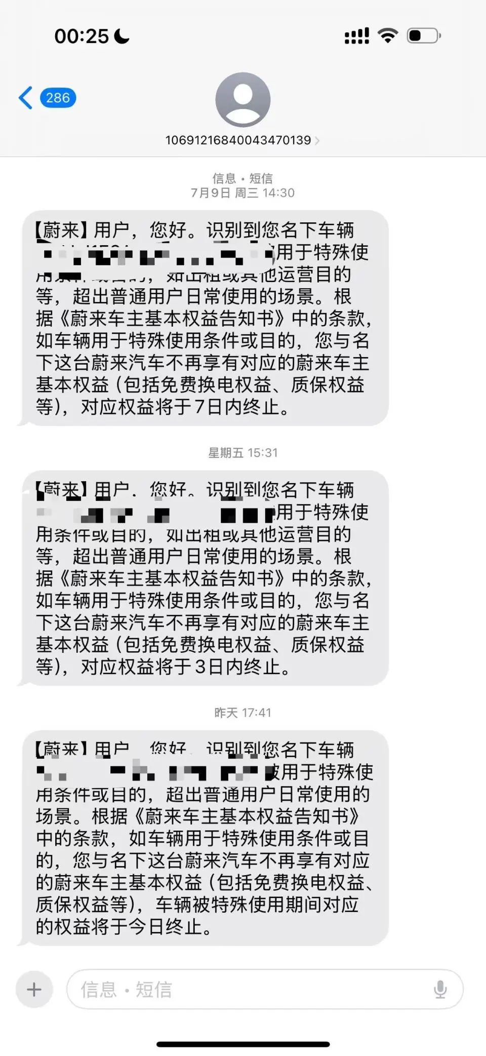 最近,家住河南的高先生遇到烦心事:他在7月9日收到蔚来汽车的短信通知,将在7个工作日后取消其终身免费换电、终身质保等核心权益,理由是车主一年跑了17万公里,远超行业标准和日常使用场景。