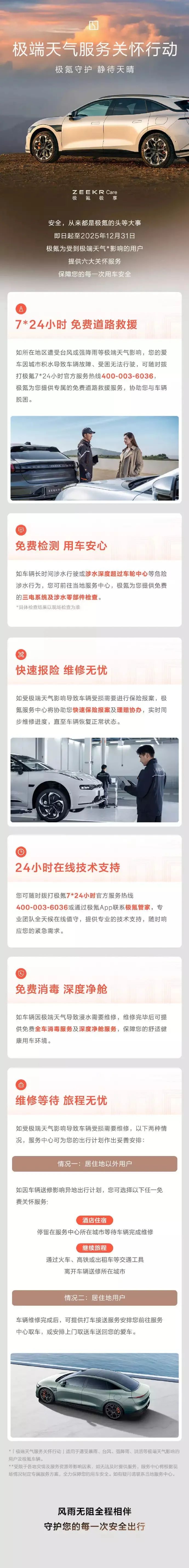 7*24 小时免费道路救援:如所在地区遭受台风或强降雨等极端天气影响,车辆因城市积水导致车辆故障、受困无法行驶,可随时拨打极氪 7*24 小时官方服务热线 400-003-6036。