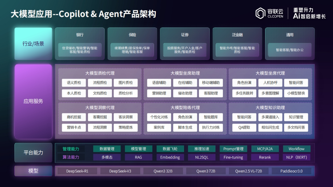容联云对AI技术的深刻理解,最终要通过产品形态触达企业需求。基于大小模型协同架构与数据飞轮机制,其推出的QM Agent(智能质检)、Agent Copilot(坐席辅助)、Insight Agent(会话洞察)等系列产品,精准切入金融等高合规行业的痛点场景,实现了从技术能力到业务价值的转化。这些产品不仅是技术的载体,更是AI新质生产力在产业端的具体呈现。