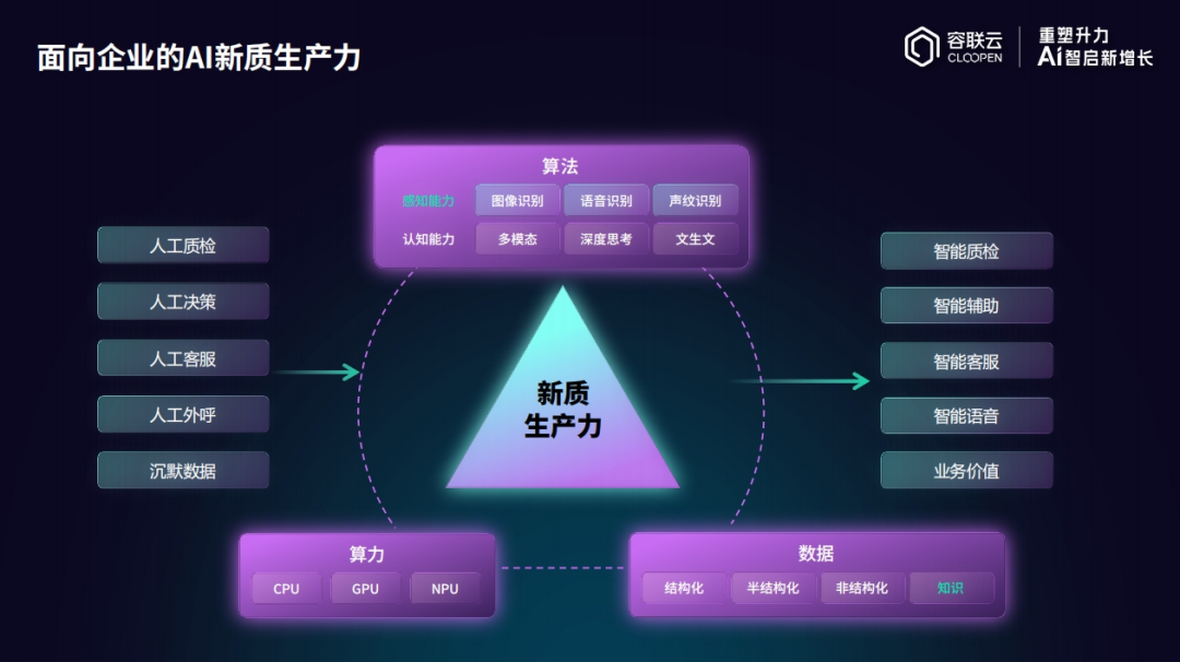 容联云大模型产品负责人唐兴才指出:“从三要素的角度来看,AI新质生产力都得到了很好的发展。算力层面,现在的计算能力比之前强很多,GPU、NPU都在快速发展;数据层面,除了数据库里的结构化数据,客服或作业人员脑子里的知识、服务记录过程中的信息,这些知识数据也能在模型层面被很好利用;算法层面,从之前小模型的算法,发展到现在感知能力、认知能力的提升,比如多模态、深度思考、文生文、文生图,认知能力的提升让很多应用能做到不一样的结果。”这种底层能力的协同进化,正是AI新质生产力爆发的基础。