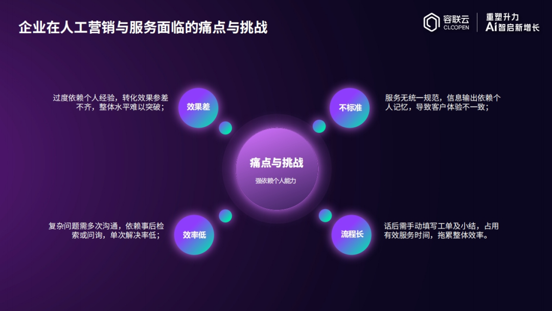 企业在营销与客服两端普遍面临诸多痛点。唐兴才提到:“营销侧的业务经理面临效率低、个人经验难传承、转化率不高的问题;服务人员则天天被成本卡脖子,面临服务标准不统一、机器人机械化服务的问题。”这些痛点,正是容联云产品落地的核心靶向。