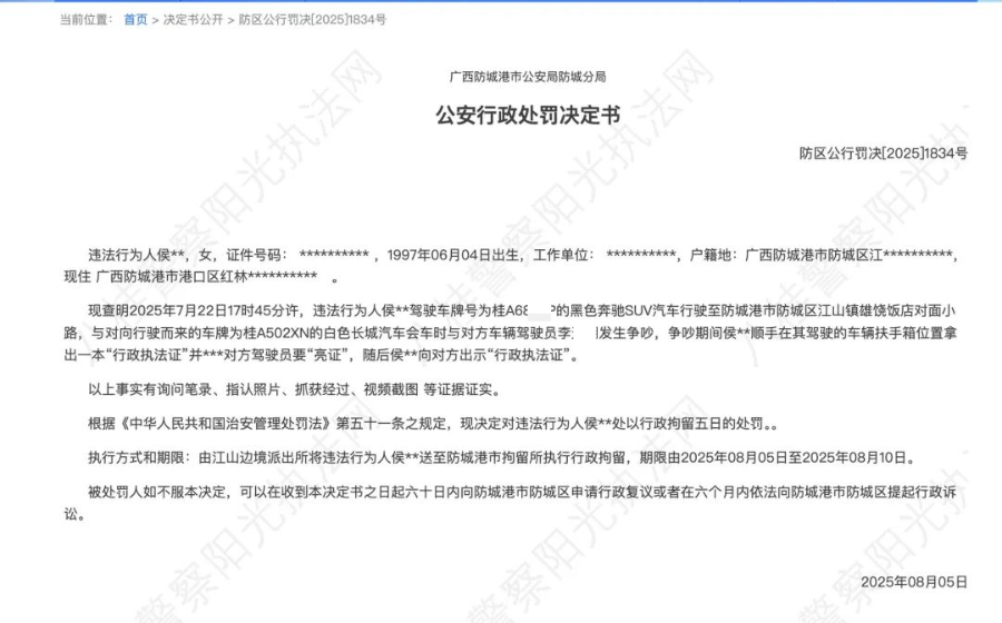 据八桂警察阳光执法网消息,2025年8月5日,广西防城港市公安防城分局公布了关于“亮证女”侯某某的公安行政处罚决定书。