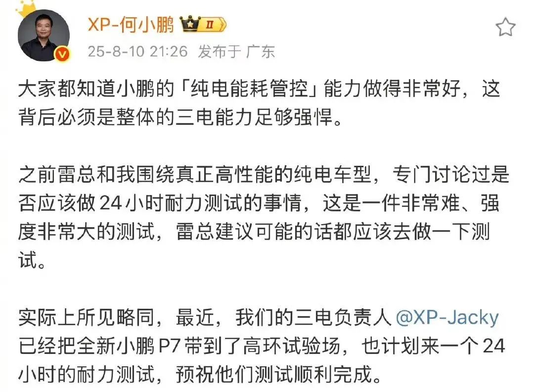 小鹏汽车董事长何小鹏发博称:之前雷军和其围绕真正高性能的纯电车型,专门讨论过是否应该做24小时耐力测试的事情,这是一件非常难、强度非常大的测试,雷总建议可能的话都应该去做一下测试。何小鹏透露,全新小鹏P7也计划来一个24小时的耐力测试。