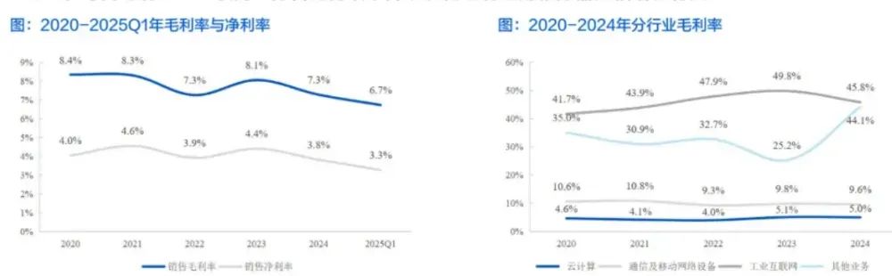 不过,2024年工业富联综合毛利率再次下滑至7.28%,主要因为AI服务器面对市场的激烈竞争,不得不提高研发投入,稀释了盈利。