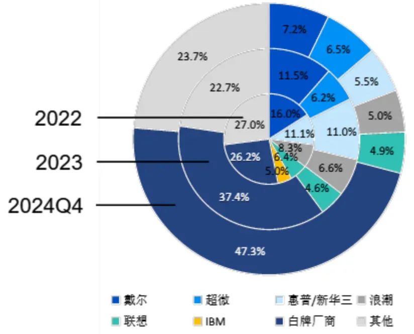 国海证券研究所数据显示,戴尔(DELL)、惠普(HP)、浪潮、联想及英伟达自有 AI 服务器品牌、富士康这些白牌厂家开始快速调整策略。