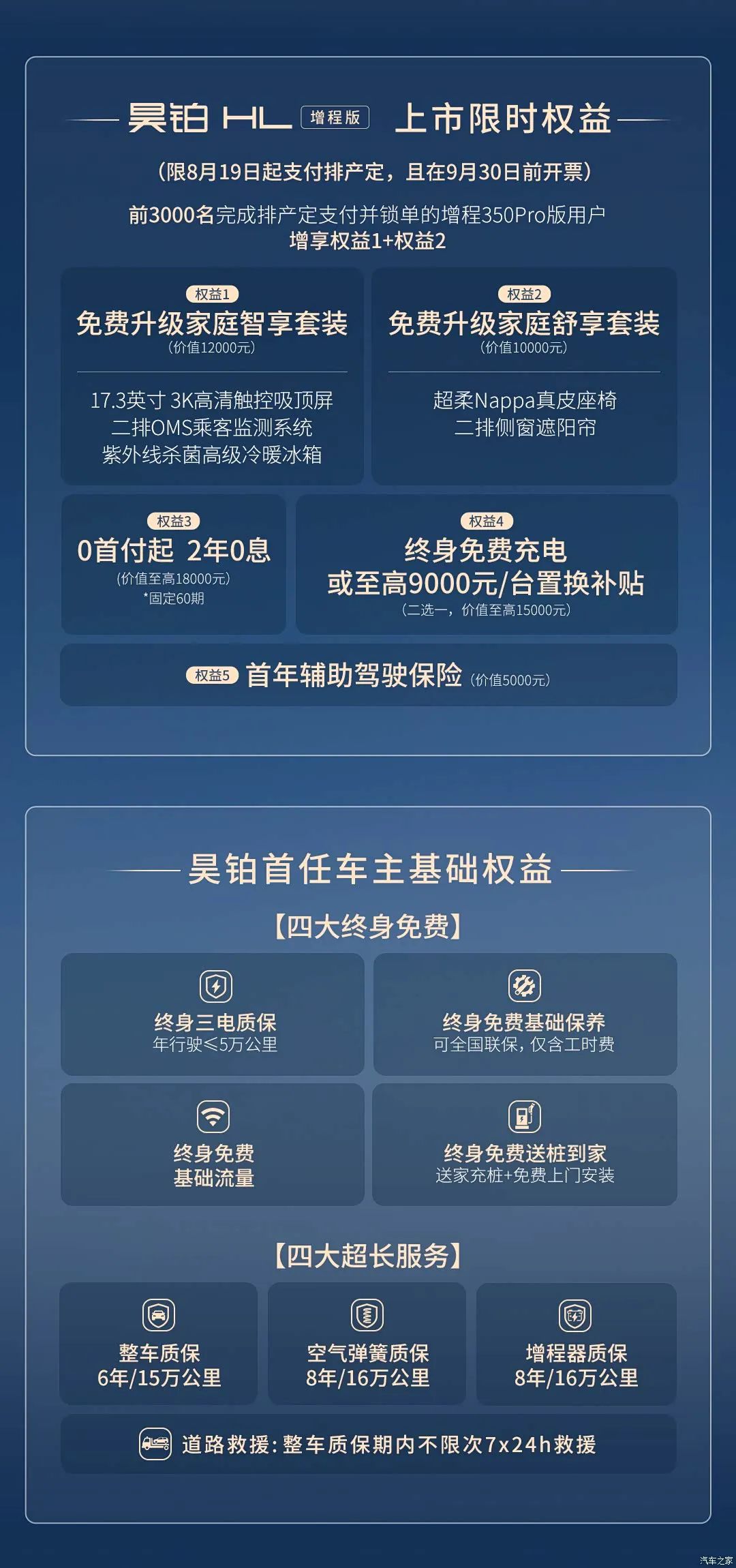 同时,官方还发布了全新的购车权益。8月19日起,购车用户可享受终身免费充电、终身免费送桩、终身免费基础保养、终身免费流量、三电终身质保等五项“终身”尊享权益,以及2年0息金融政策和首年辅助驾驶保险;Pro版额外赠送家庭舒享套装(含超柔NAPPA真皮座椅、二排侧窗遮阳帘)、家庭智享套装(含二排17.3寸3K高清触控吸顶屏、后排OMS乘客监测系统、紫外线杀菌高级冷暖冰箱)。