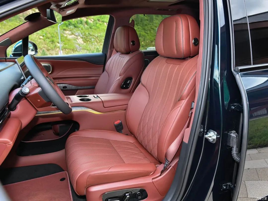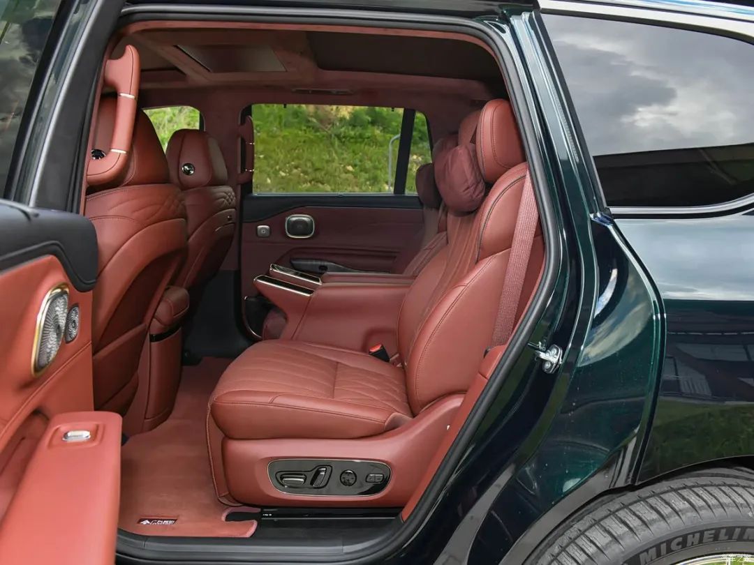 此外,车内大量位置采用软质材料包裹,例如Alcantara全麂皮顶棚,大面积使用红棕色的超柔NAPPA材质,另外座椅的菱形皮革缝线、四门饰板与副仪表台选用百年影木木皮装饰等,也进一步加强了豪华氛围。新车采用了2+2+2的六座空间布局,二排标配双零重力座椅,拥有127.5度黄金零压角设计,拥有12向电动调节、一键零重力躺平功能和18点热石按摩,且有12种按摩模式可选,座椅还配备豪华MPV风格的双固定扶手屏。