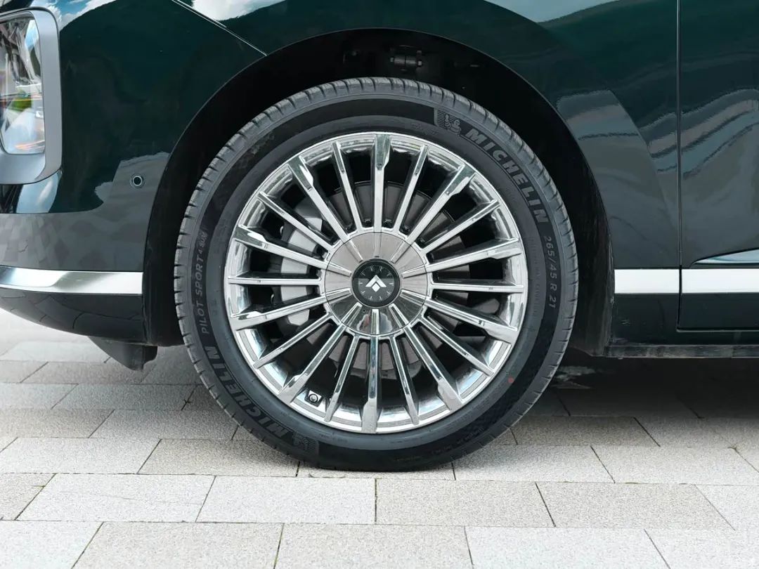 侧面来看,新车整体造型看上去非常巨大,拥有游艇式车身设计,车辆配备了隐藏式门把手以及独特的隐藏式B柱和带“Hyper”标识的银色D柱设计。此外,新车还将配备21英寸密条辐轮圈,进一步提升车辆的豪华质感。车身尺寸方面,其长宽高分别为5126/1990/1730(1750)mm,轴距3088mm。