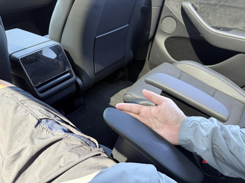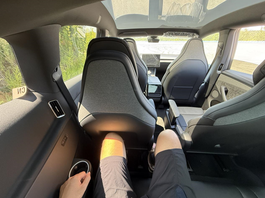 至于坐起来的感觉,这次我特地带上了团队伙伴小尤,他是5座Model Y的车主。他身高183,先把前排调到驾驶位置,二排再保留一拳腿部空间,这时候再坐进三排,中间过道还算来去自如,但三排感觉比较局促,几乎没有腿部空间,头部空间也非常少。