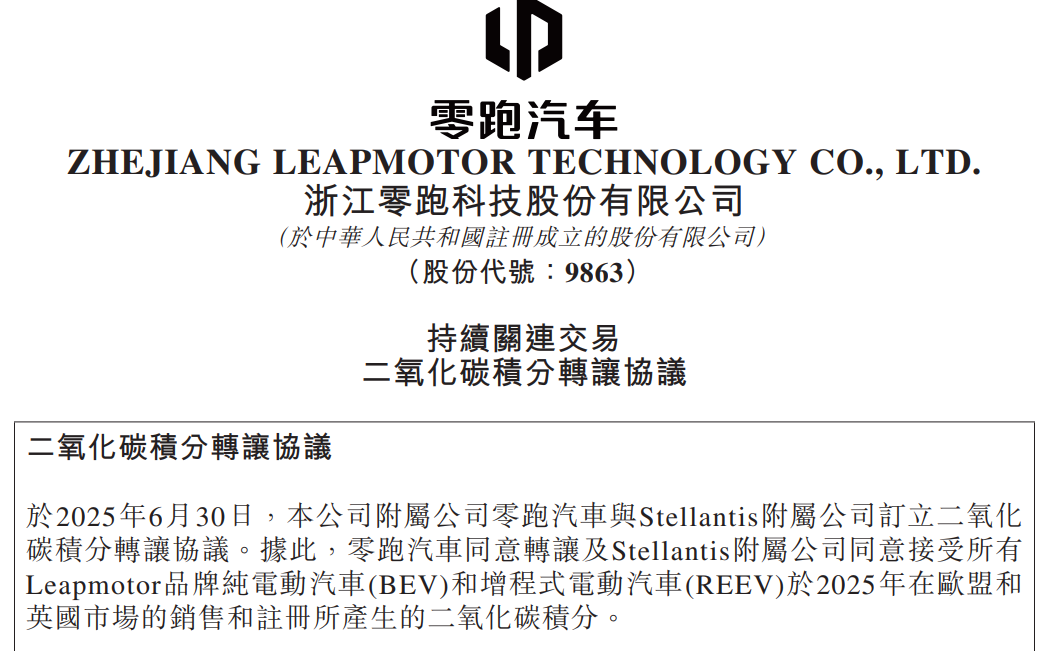 今年7月该司披露的一份文件显示,彼时零跑汽车将自己的碳积分转让给了Stellantis,期限半年,价格为人民币15亿元,数值远大于净利润的0.3亿元。