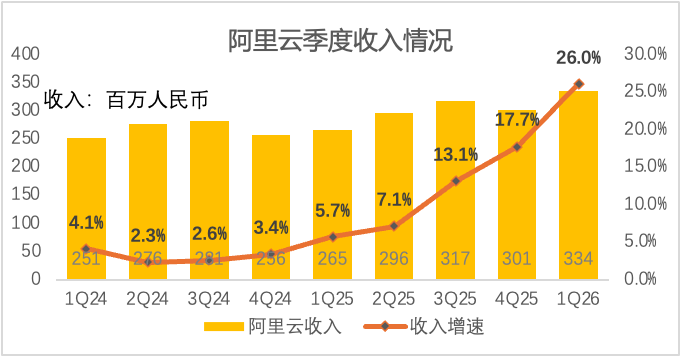 持续的AI投入让阿里云更好地承接了暴涨的AI需求,推动阿里云收入增长持续加速。财报显示,过去四个季度,阿里云季度收入增速分别为7.1%、13.1%、17.7%、26.0%。