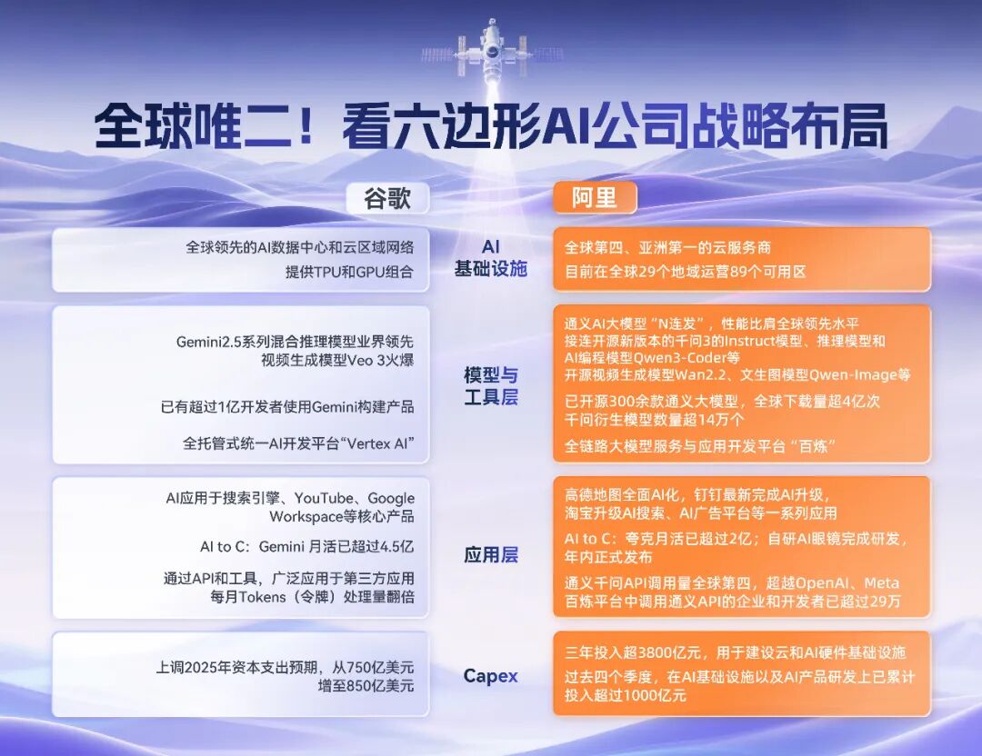 放眼全球,阿里与谷歌是全球唯二具有全栈AI技术能力的公司,能从AI硬件、云计算到先进模型,再到AI应用的垂直纵向整合,形成超级集成。与之对应的是横向AI全家桶公司,如OpenAI包含了Chat、搜索、Coding、Agent、Workspace等AI应用。