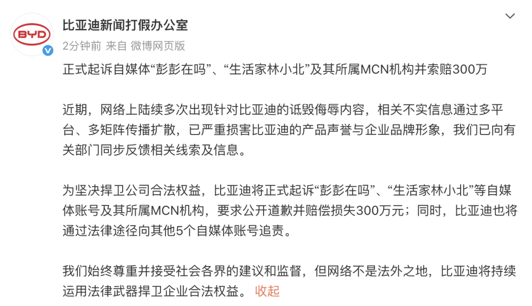 9月4日,@比亚迪新闻打假办公室 发文称将起诉自媒体“彭彭在吗”“生活家林小北”及其所属MCN机构,要求公开道歉并赔偿损失300万元。同时,比亚迪也将通过法律途径向其他5个自媒体账号追责。