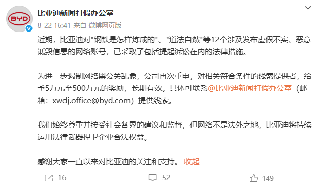 此前的8月22日,@比亚迪新闻打假办公室 曾发文称,近期,比亚迪对"钢铁是怎样炼成的"、"道法自然"等12个涉及发布虚假不实、恶意诋毁信息的网络账号,已采取了包括提起诉讼在内的法律措施。