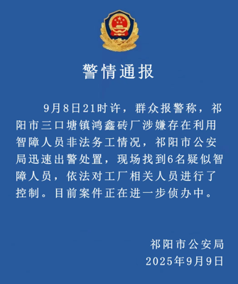 《法治日报》记者9月9日从湖南省祁阳市公安局官方微信公众号“祁阳公安”获悉,9月8日晚,根据群众报警线索,当地一砖厂涉嫌非法雇用智障人员务工。警方迅速出动,在现场查获6名疑似智障人员,并依法控制涉事工厂相关负责人。目前,案件正在进一步侦办中。