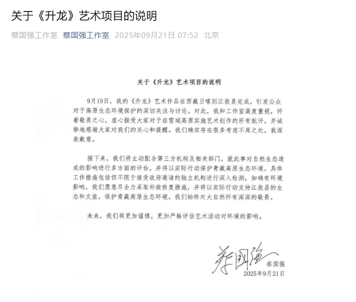 同日早间,蔡国强工作室微信公号发布 “关于《升龙》艺术项目的说明”,表示高度重视公众讨论,虚心接受批评,将主动配合第三方机构及相关部门评估生态影响,若有环境影响将尽全力补救,以实际行动支持江孜县生态和文旅,未来会更谨慎评估艺术活动对环境的影响。