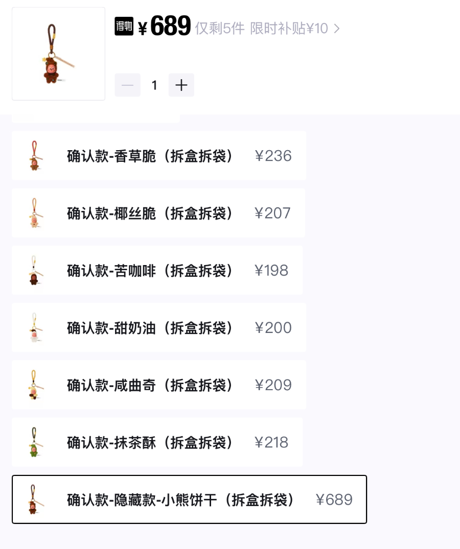 相比发售价格,二手平台上原价69元的手办产品最高涨至119元,系列产品内原价59元的毛绒挂件则更受欢迎,隐藏款“小熊饼干”最高成交价从59元上涨至689元,溢价率近10倍,是近期溢价最高的产品;单个随机盲盒成交价从59元上涨至182元,整盒成交价从354元上涨至769元,溢价率均超2倍,溢价幅度与此前爆火的迷你版Labubu(心底密码系列)不相上下。