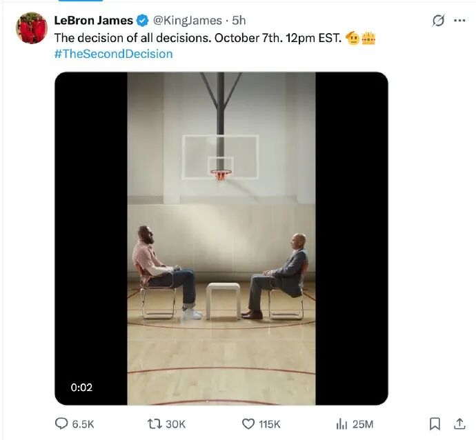 北京时间10月7日,湖人巨星詹姆斯在社交媒体发布了一个名为“第二次决定”的短视频预告:“这可是个重中之重的决定。10月7号,美国东部时间中午12点见分晓。”