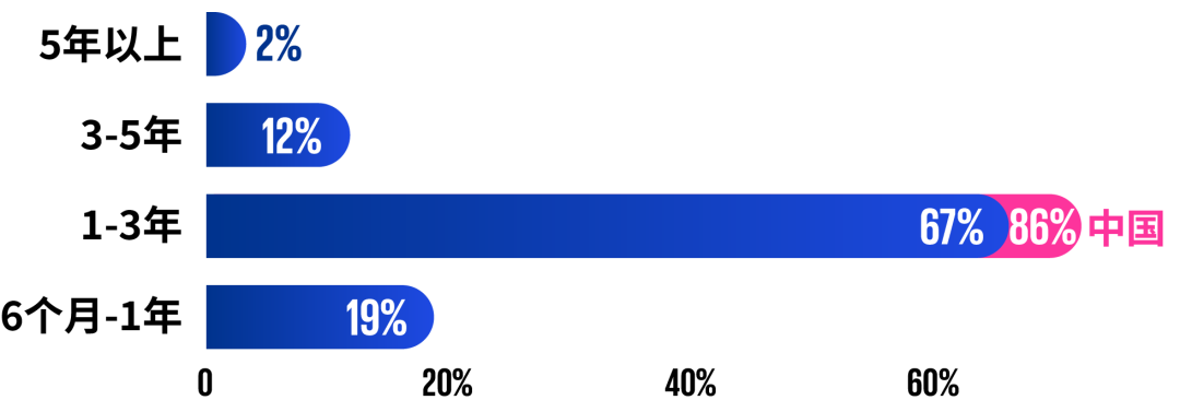 人工智能应用价值已初步兑现,86%的中国首席执行官预期人工智能投资回报期在三年之内,远高于去年的18%。其中,更有20%认为不到一年就能看到实施人工智能的投资回报。