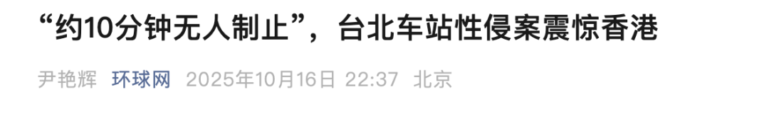 据台湾联合新闻网10月16日报道,台湾台北车站大厅近日发生性侵案,其间人潮穿梭却无人制止,受害者是一名香港女游客,引起香港媒体注意。香港网友纷纷表示愤怒,“竟然没有人帮忙”“台湾人自夸的人情味还在吗”“原来周围那么多人,都没有人去阻止他”“现在台湾的治安真的令人担心”。