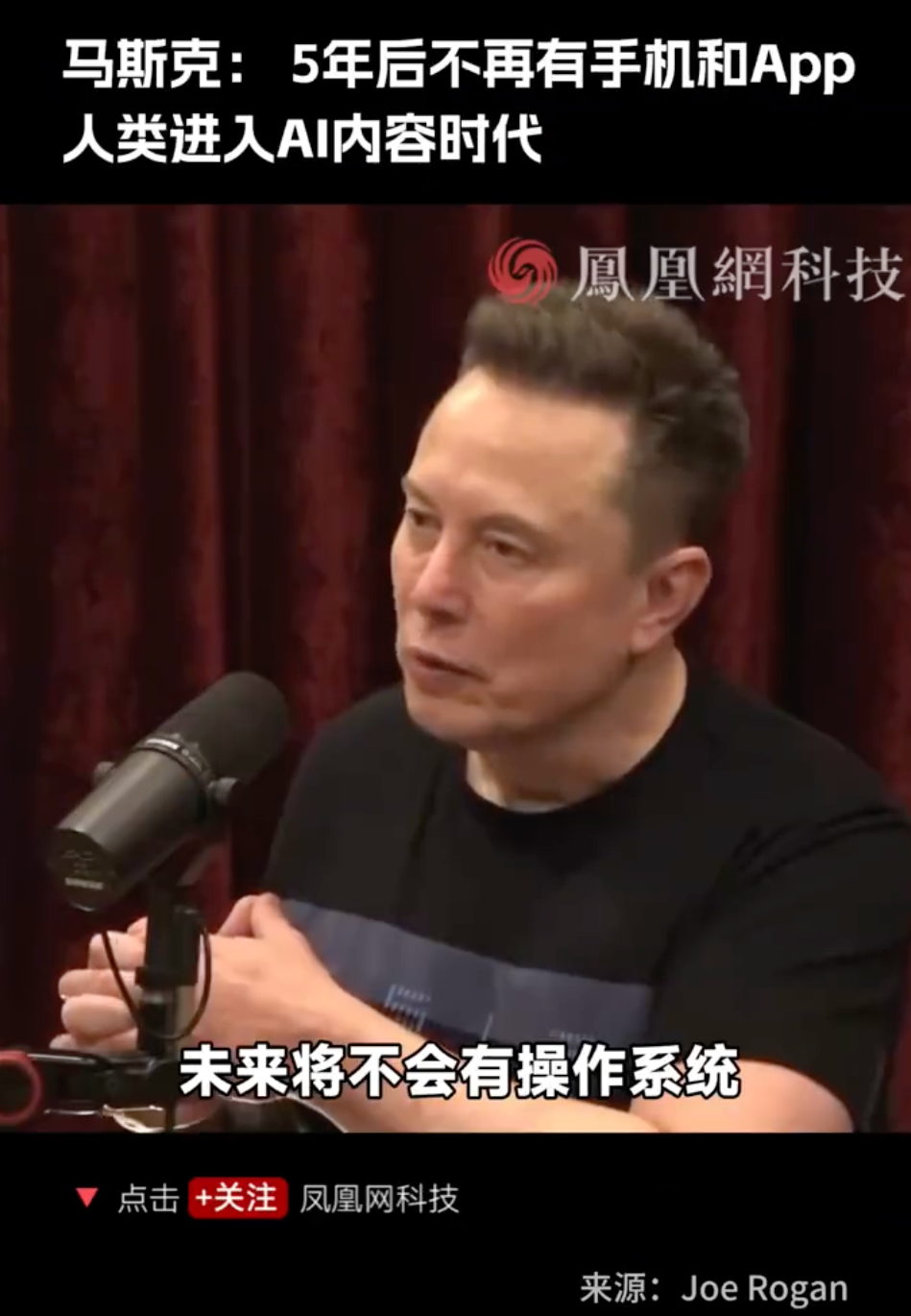 据凤凰网科技报道,美国知名播客主持人乔·罗根在其频道发布了与特斯拉CEO埃隆·马斯克的最新对谈视频,视频中马斯克提出了一个大胆预测:未来五到六年内,传统手机和App将被淘汰,人类消费的大多数内容都将由AI生成。