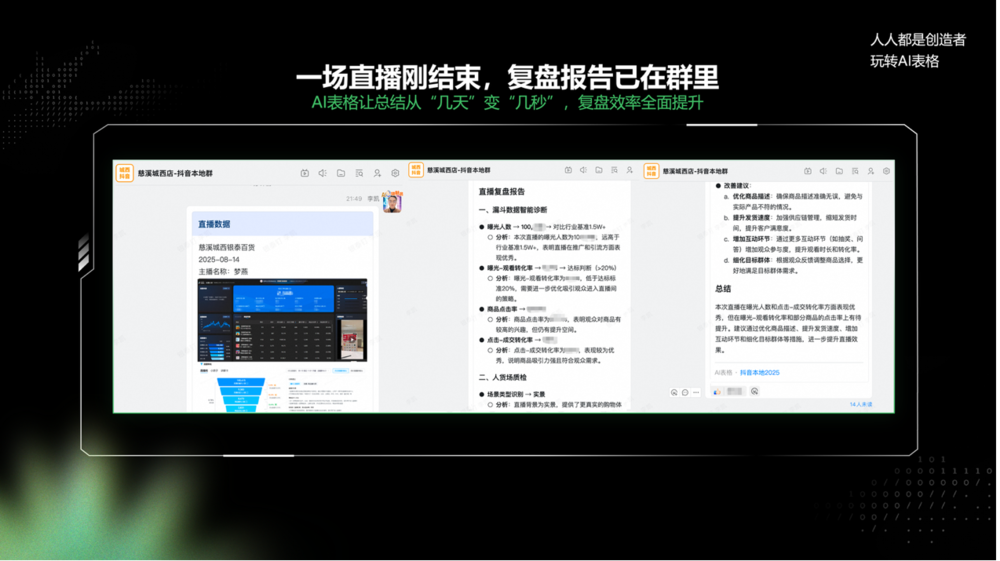 未来,组织不再依赖层级运转,而更多依赖 AI 表格的智能驱动:一个用户的情绪波动、一场直播的库存变化、一个 SKU 的异常反馈,都会在几分钟内形成新的决策。