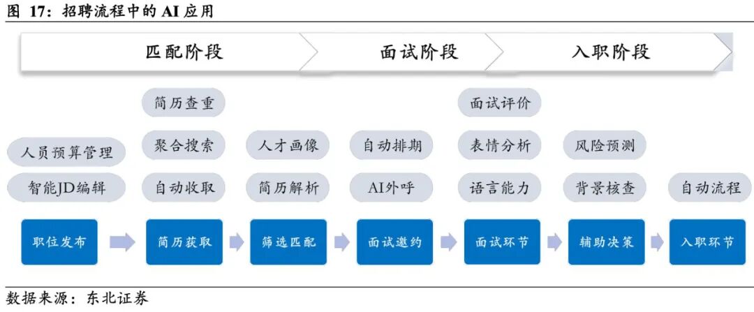 东北证券研报显示,招聘服务因其低频、刚需、强非标特性,是AI应用最充分的产业环节。