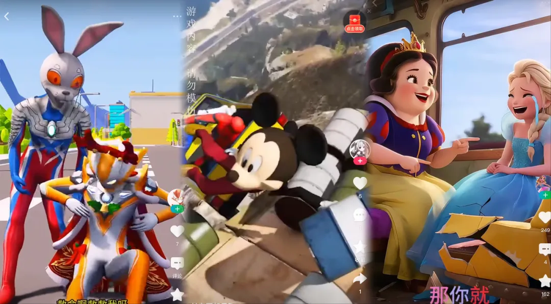 网络平台上存在的“兔头面具奥特曼打晕绑架小奥特曼”“米奇在山顶脚踹蜘蛛侠”“白雪公主霸凌艾莎”等内容。图片来源:潮新闻