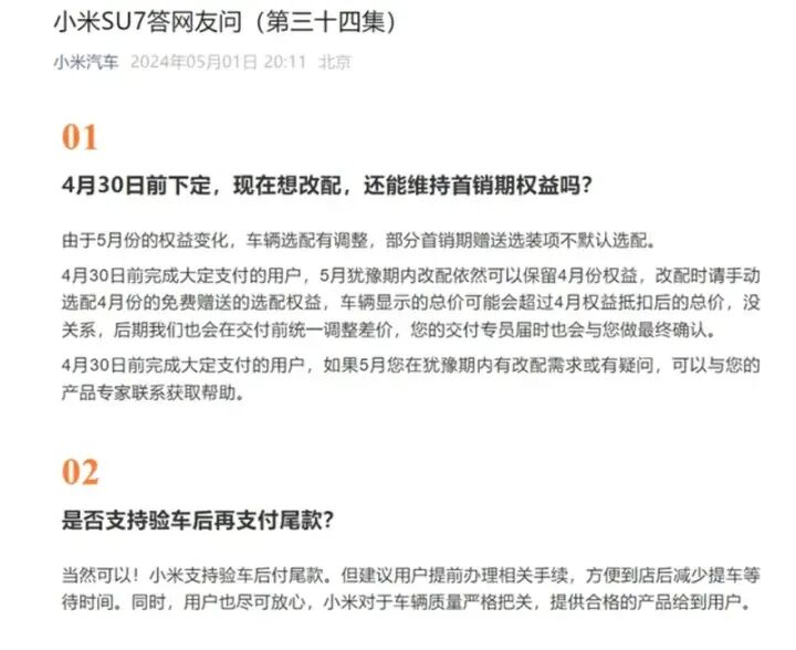 小米汽车官方微信公众号在《小米SU7答网友问(第三十四集)》中明确表示“支持验车后付尾款”