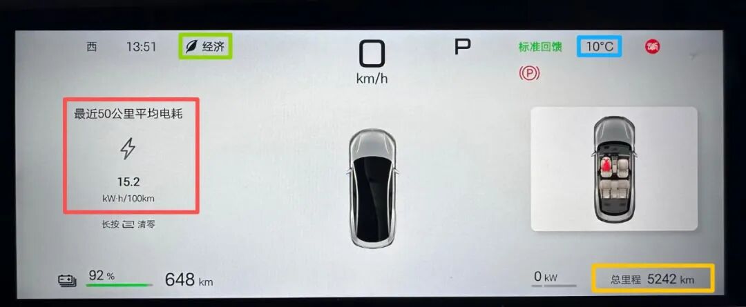 当这台在北京进行长测的汉L EV后驱版行驶里程为5242公里时,日期2025年11月26日、室外温度10摄氏度、最近50公里平均电耗为15.2度电,常态化选择经济模式。