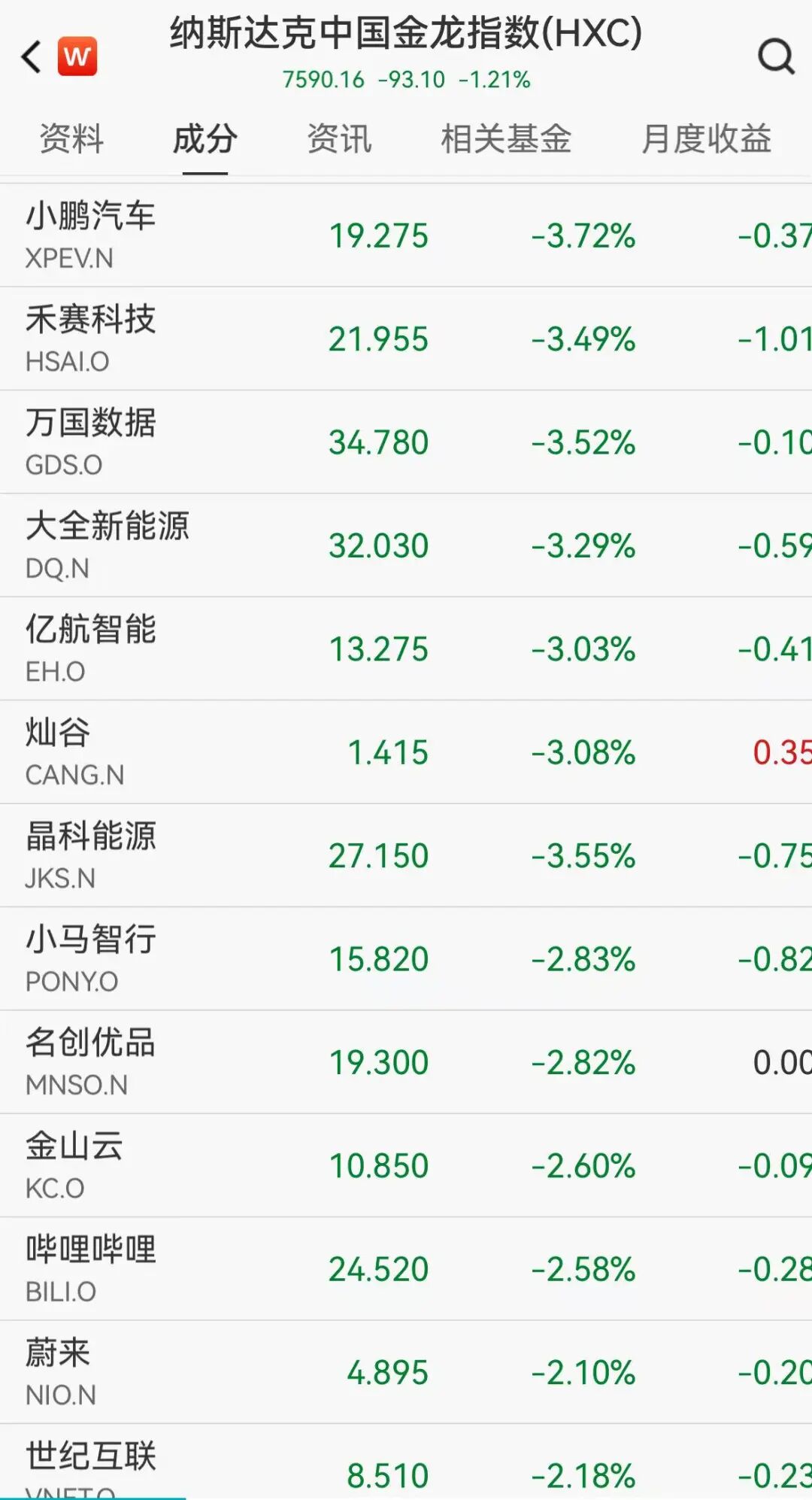 纳斯达克中国金龙指数跌1.2%,热门中概股多数承压,小鹏汽车跌超3.7%,名创优品、蔚来、理想、B站、金山云均跌超2%。