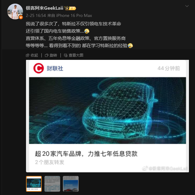 近日,有博主@极客阿来GeekLaii称,我说了很多次了,特斯拉不仅引领电车技术革命还引领了国内电车销售政策…