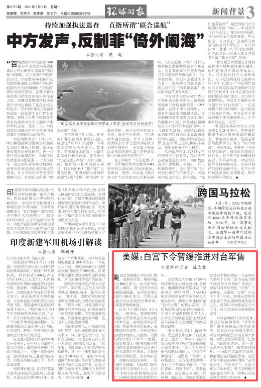 台湾《中国时报》3月1日称,一般来说,美国国务院会将拟议军售案送交参众议院相关委员会,由两党资深议员审查;若取得非正式批准,通常随即对外宣布,并送交国会完成程序性的正式批准。而据《纽约时报》2月27日披露,这项军售案1月被美国国务院送交跨党派资深国会议员进行非正式审查后已获批,目前进入程序后期阶段,但该案此后就一直躺在美国国务院。一名美国官员透露,行政部门曾告知部分参与审查的人士,白宫已下令相关机构暂缓推进该案,以确保美国总统能顺利访华。