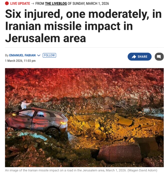 据《以色列时报》及现场消息披露,3月1日,一枚伊朗导弹在耶路撒冷周边爆炸。报道称,导弹爆炸后在路面留下明显弹坑,周边多辆汽车受损严重,交通标志牌被直接炸飞。