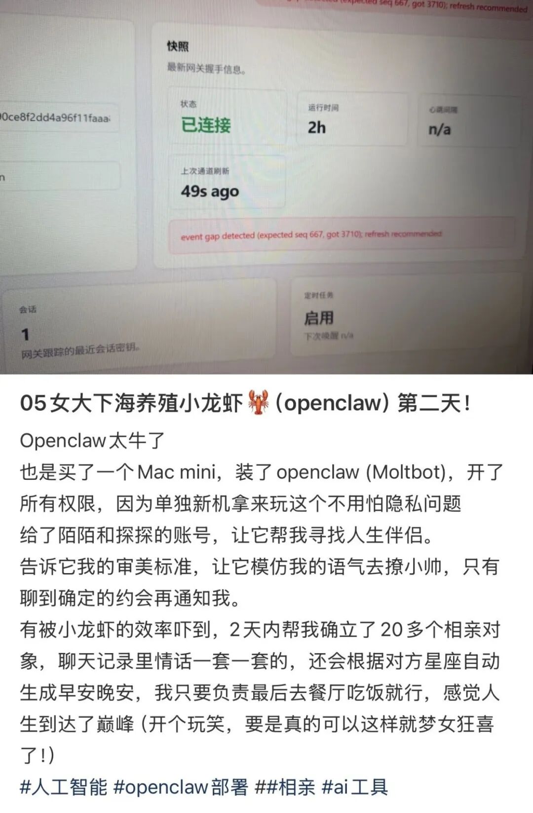 假如你没有那么多商务需求让OpenClaw操作,它甚至可以自动帮你在网上谈恋爱。