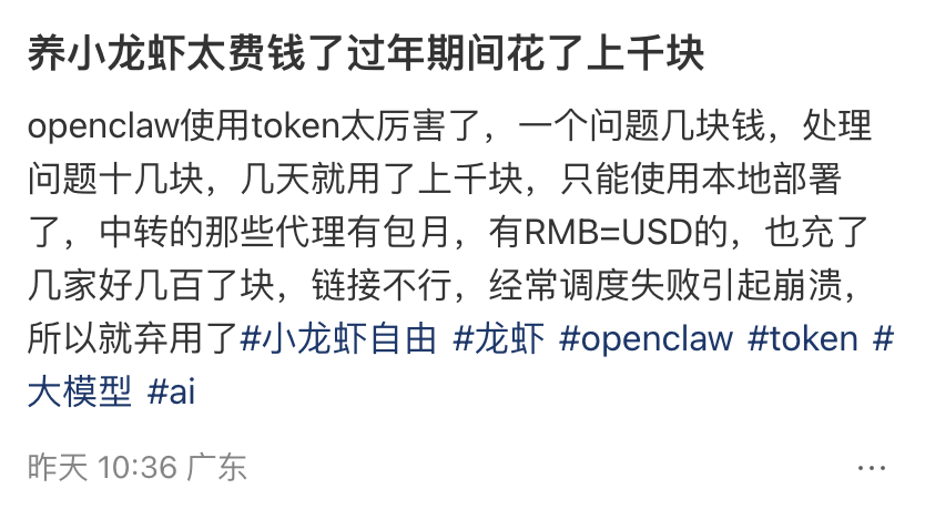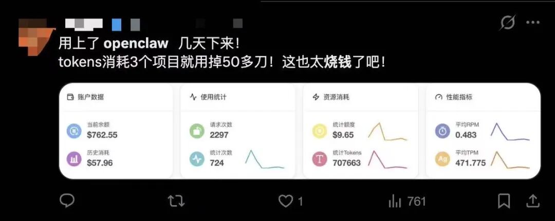 有网友的OpenClaw,一天“吃饭”需要花400块。