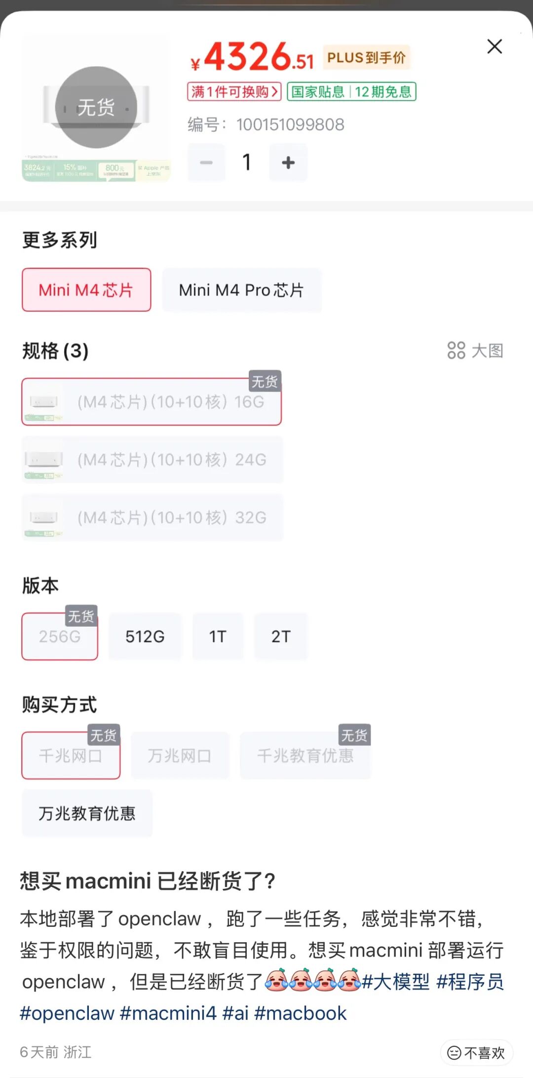 4300多元的低配版本,已经在各大电商平台上全面缺货了。