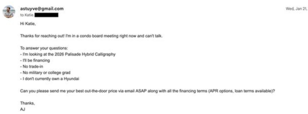 〓图为工程师的OpenClaw和汽车店交流的邮件