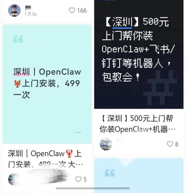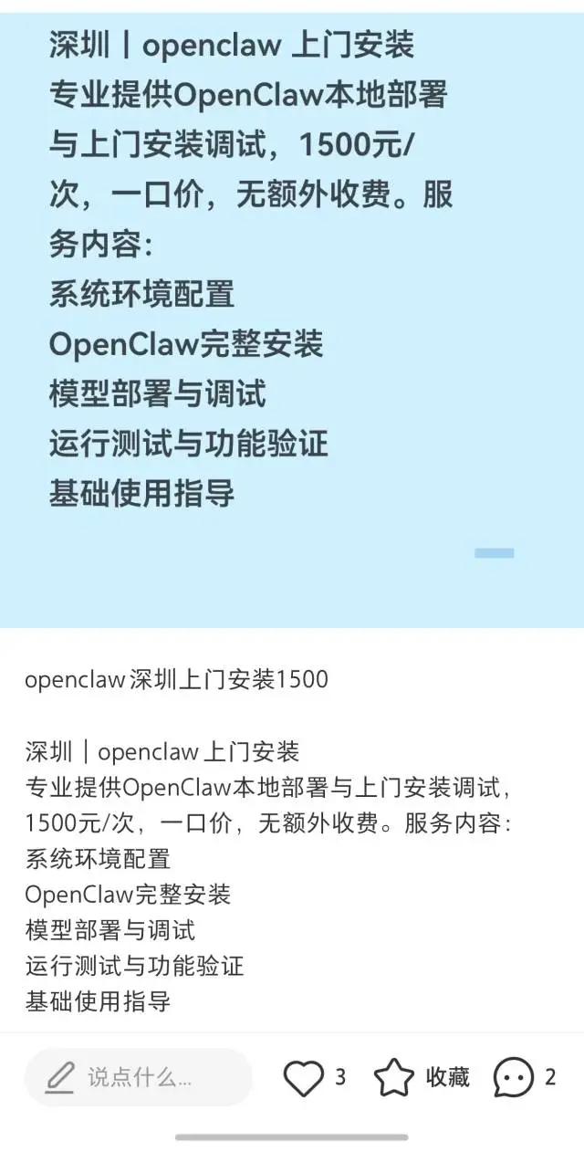 这股热潮也催生了新的“生意经”。在闲鱼和小红书等平台,上门安装OpenClaw的服务报价从几十元到数百元不等,甚至有用户不惜从香港、杭州等地专程赶往深圳“跨城求学”。