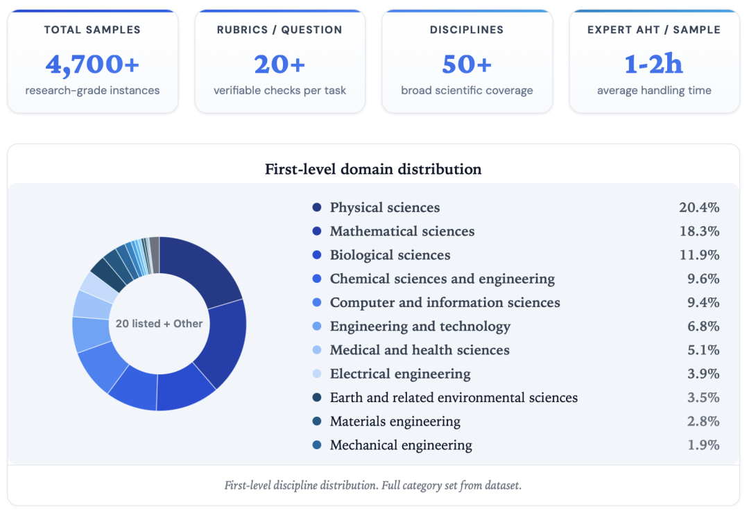 当前数据集仍在持续扩展中,已包含超过 4,700 个研究级实例,每个实例附有 20+ 条 Rubric 项,覆盖 50+ 学科和 400+ 研究方向。