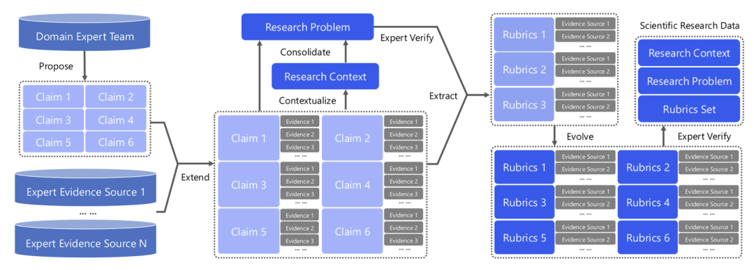 同步合成评测 Rubrics。这些 Rubrics 不评估文风或格式等表面质量,而是评估具体的科学发现是否已被达成