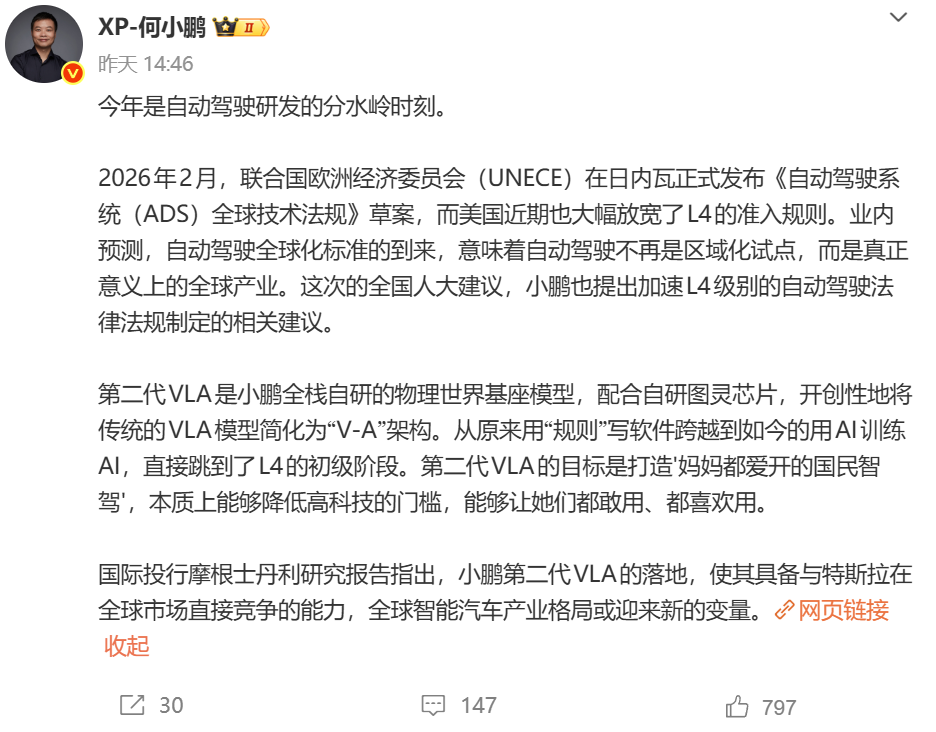 在何小鹏看来,L4级无人驾驶时代,来得会比许多人想象中更早。他在微博上声称“今年是自动驾驶研发的分水岭时刻”,而且小鹏“全栈自研”的“物理世界基座模型”第二代VLA,已经“直接跳到了L4的初级阶段。”