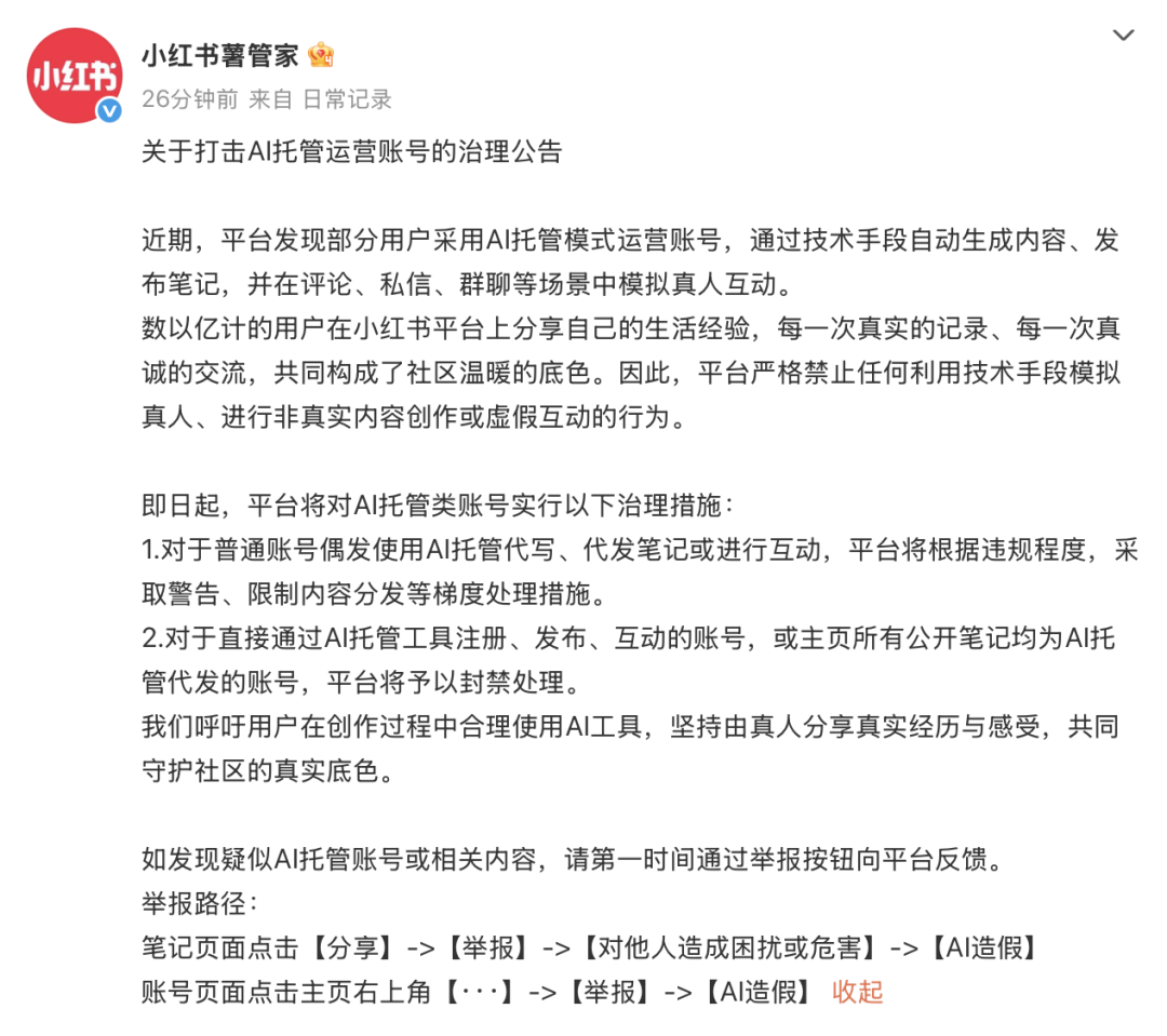 2.对于直接通过AI托管工具注册、发布、互动的账号,或主页所有公开笔记均为AI托管代发的账号,平台将予以封禁处理。