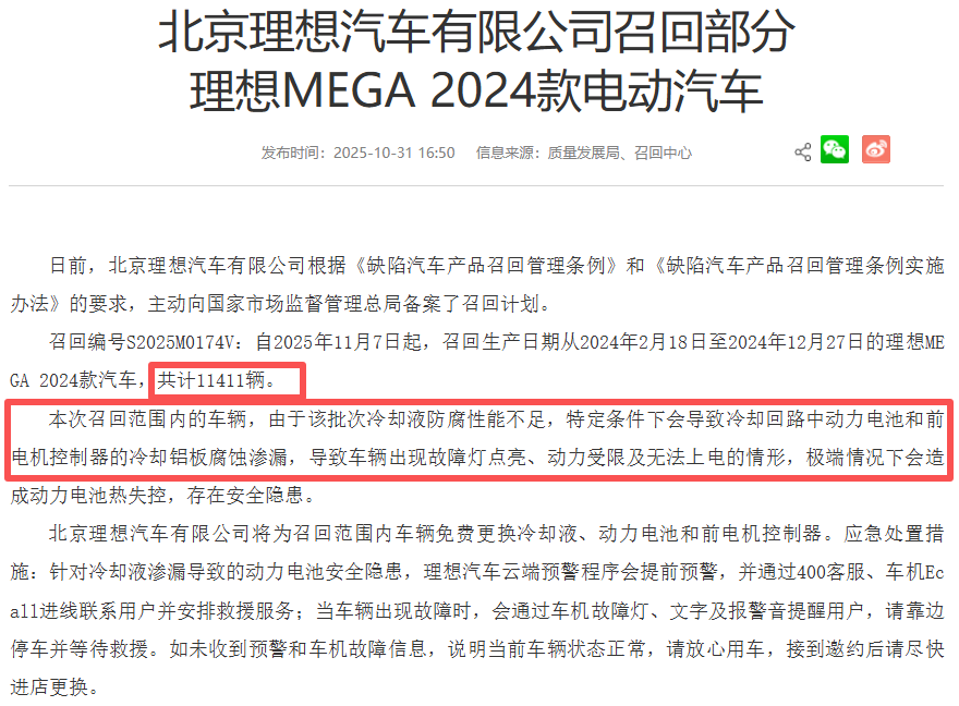 起火的后续是,理想不得不召回1.14万辆MEGA“返厂”维修。