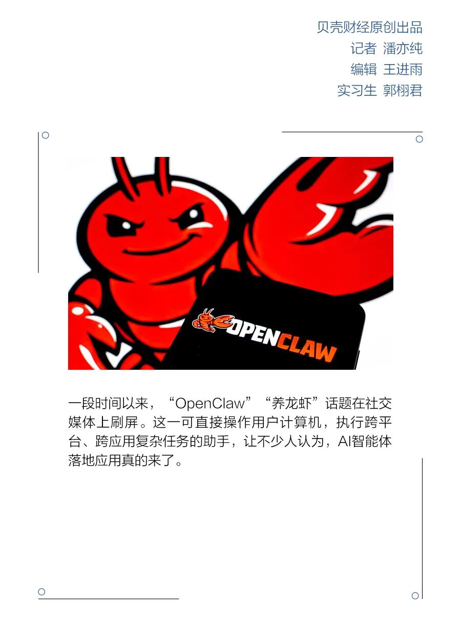 一段时间以来,“OpenClaw”“养龙虾”话题在社交媒体上刷屏。这一可直接操作用户计算机,执行跨平台、跨应用复杂任务的助手,让不少人认为,AI智能体落地应用真的来了。