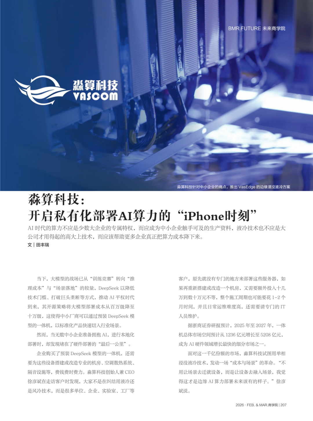 AI时代的算力不应是少数大企业的专属特权,而应成为中小企业触手可及的生产资料,液冷技术也不应是大公司才用得起的高大上技术,而应该帮助更多企业真正把算力成本降下来。淼算科技正试图用单相浸没液冷技术,发动一场“成本与场景”的革命。