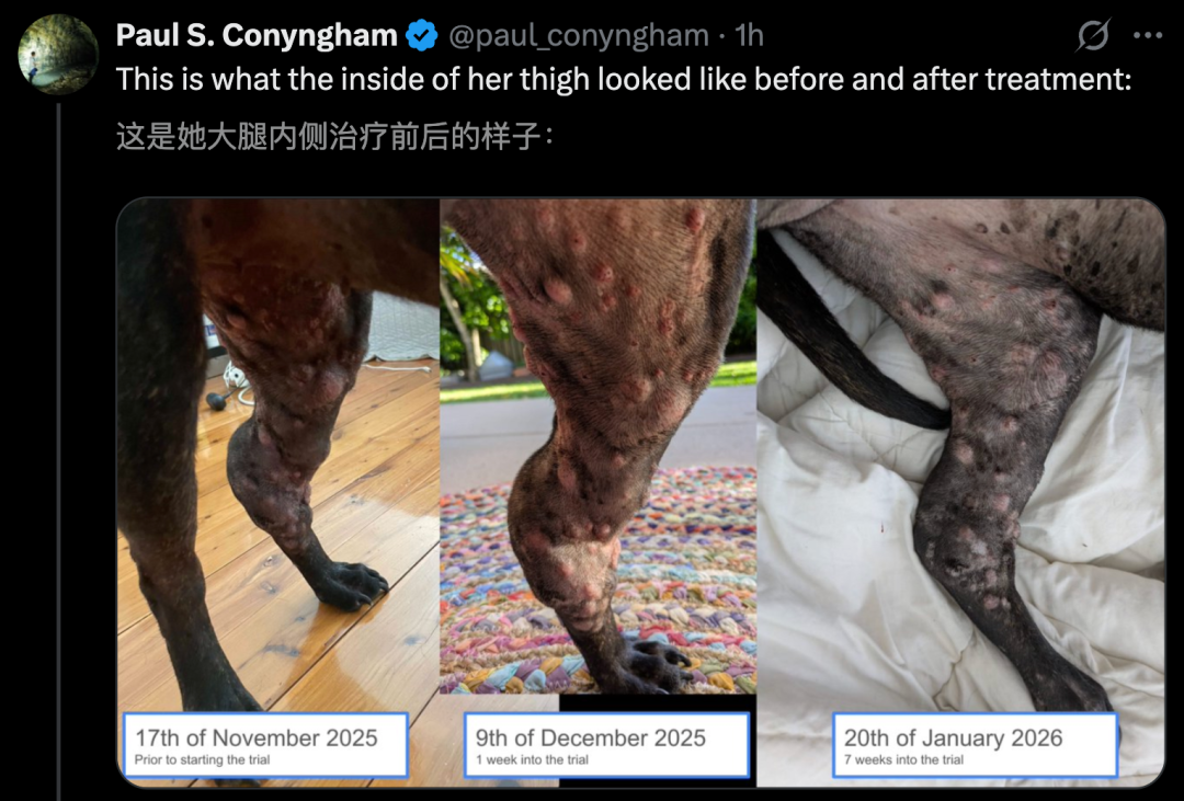 短短数周,Rosie在接受定制的mRNA 癌症疫苗治疗后,后腿关节上那个网球大小的肿瘤竟「缩小了一半」!