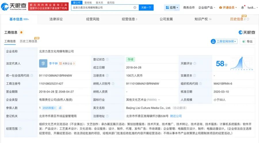 天眼查App显示,“力擎GEO优化系统”关联公司北京力思文化传媒有限公司成立于2018年4月,法定代表人为李千钟,注册资本100万人民币,经营范围包括组织文化艺术交流活动、文艺创作、承办展览展示活动等,由李千钟全资持股。知识产权信息显示,今年2月,该公司登记“媒体发文及管理平台”软件著作权。此外,该公司近期申请注册“壹豹客”“力擎”商标,国际分类涉及网站服务、科学仪器。分支机构信息显示,该公司去年6月成立了北京力思文化传媒有限公司青岛分公司。参保人数信息显示,2025年该公司参保人数为1人,此前该公司连续多年参保人数为0。