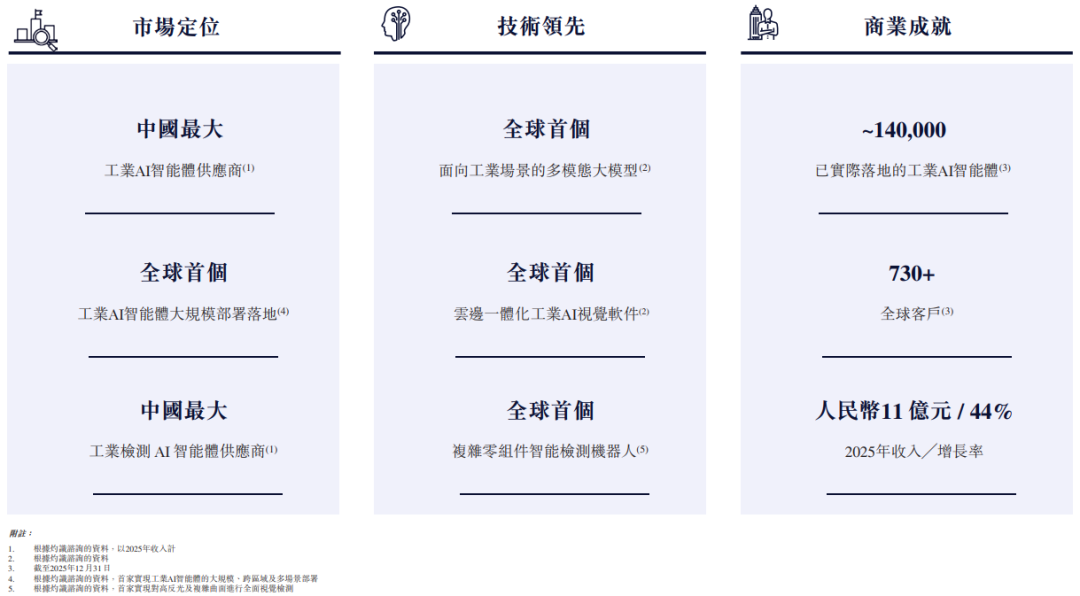 截至2025年12月31日,公司已累计向多个行业垂直领域,包括消费电子、新能源、精密制造、轨道交通及其他行业交付约140,000个尖端工业AI智能体。该等工业AI智能体已部署于客户的核心产品及生产流程中。截至2025年12月31日,公司的机器人已累计完成超过170亿件产品或零部件的检测。